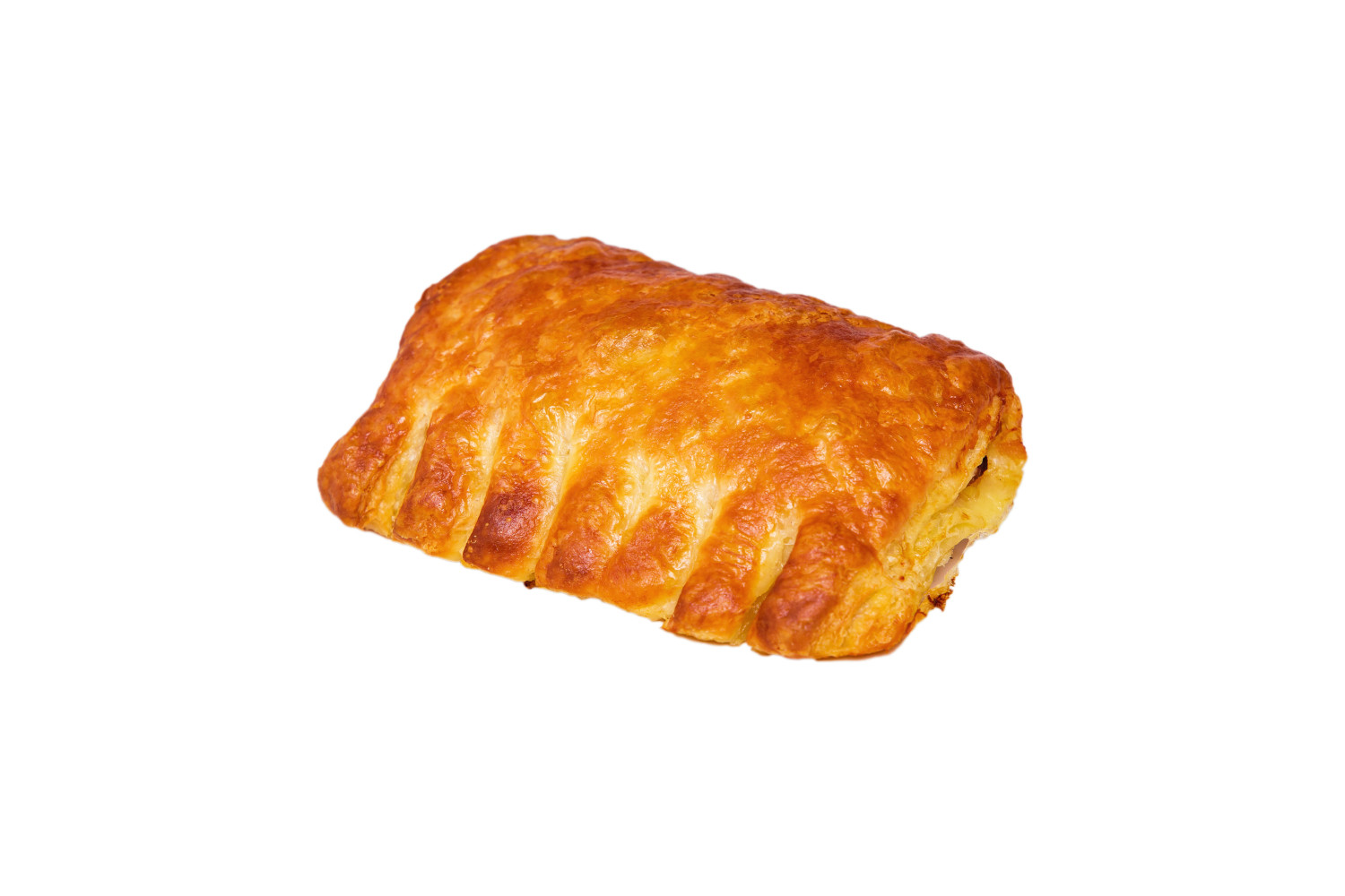 Tanskalainen leivonnainen savustetulla kanatäytteellä, maustettu ruohosipulilla, sipulilla ja pippurilla.