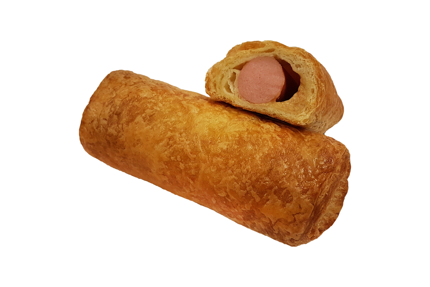 Hiivataikinarulla makkaralla ja sinappi-kurkkutäytteellä. Vähälaktoosinen.