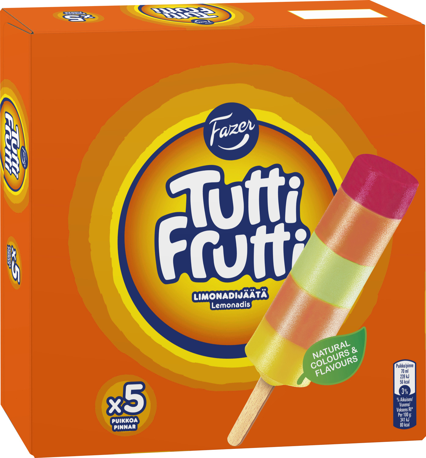 Fazer TuttiFrutti limonadijääpuikko tuo iloa ja aurinkoa päivään! Raikas sekoitus sitruunan-, hedelmäsekoituksen-, päärynän- ja mansikka-vadelmanmakuista limonadijäätä. Fazer-jäätelöt - Maut, joita jo rakastat. Fazer-jäätelöiden tuoteperhe koostuu suosituista Fazerin makeisbrändeistä.Lue lisää