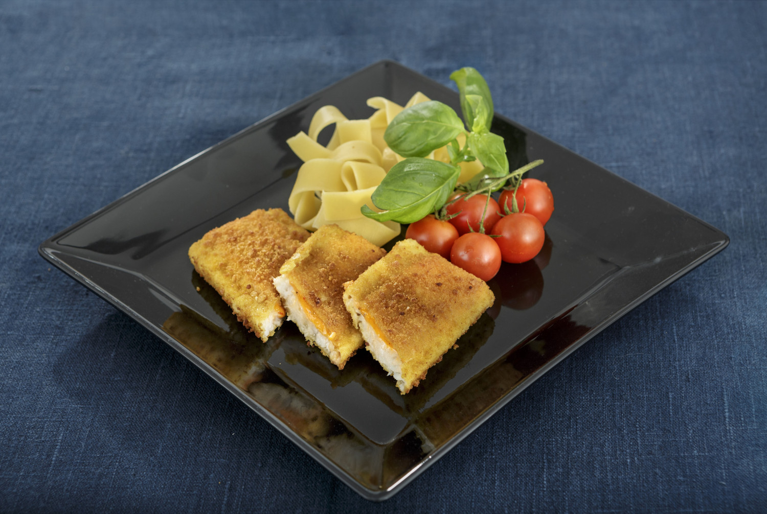 ALASKANSEITI* (Theragra chalcogramma) 50 %, VEHNÄJAUHO, rapsiöljy, vesi, MAITO, tomaatti 2,7 %, mozzarellajuusto 2,5 % (MAITO), riisitärkkelys, rasvaton MAITOJAUHE, tomaattipyree, suola, riisijauho, KANANMUNANVALKUAISJAUHE, hiiva, herajauhe (MAITO), KANANMUNAJAUHE, mausteet, KANANMUNANKELTUAISJAUHE, valkosipuli, juusto (sis. MAITO, KANANMUNA), sokeri, yrtit. *Pyydetty koilliselta tai luoteiselta Tyyneltämereltä.