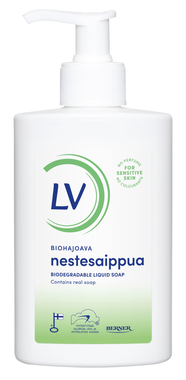 Biohajoava nestesaippua on herkälle iholle luontoa kunnioittava vaihtoehto niin kotiin kuin kesämökillekin. Hajusteeton ja väriaineeton nestesaippua sopii käsien ja tarvittaessa vartalonkin pesuun koko perheelle. Aitoa saippuaa. Kehitetty yhdessä Allergia- ja Astmaliiton kanssa. Valmistettu Suomessa ja tuotteelle on myönnetty Avainlippu-tunnus.