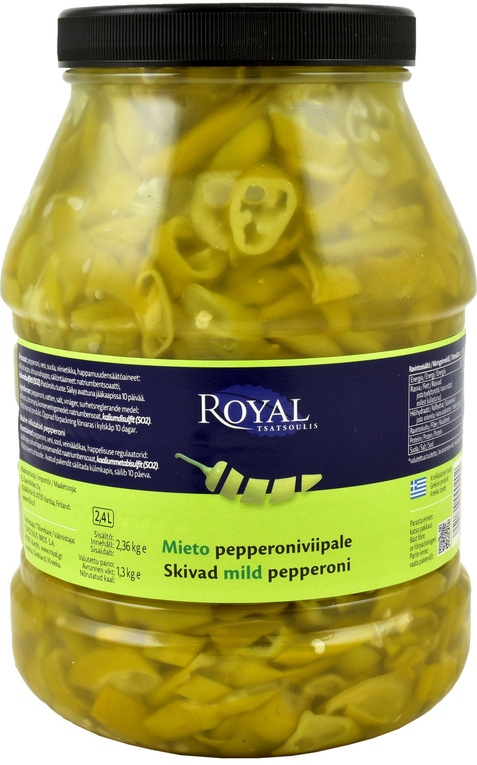 Pepperoni, vesi, suola, viinietikka, happamuudensäätöaine: etikkahappo, sitruunahappo, säilöntäaineet: natriumbentsoaatti, KALIUMDISULFIITTI.