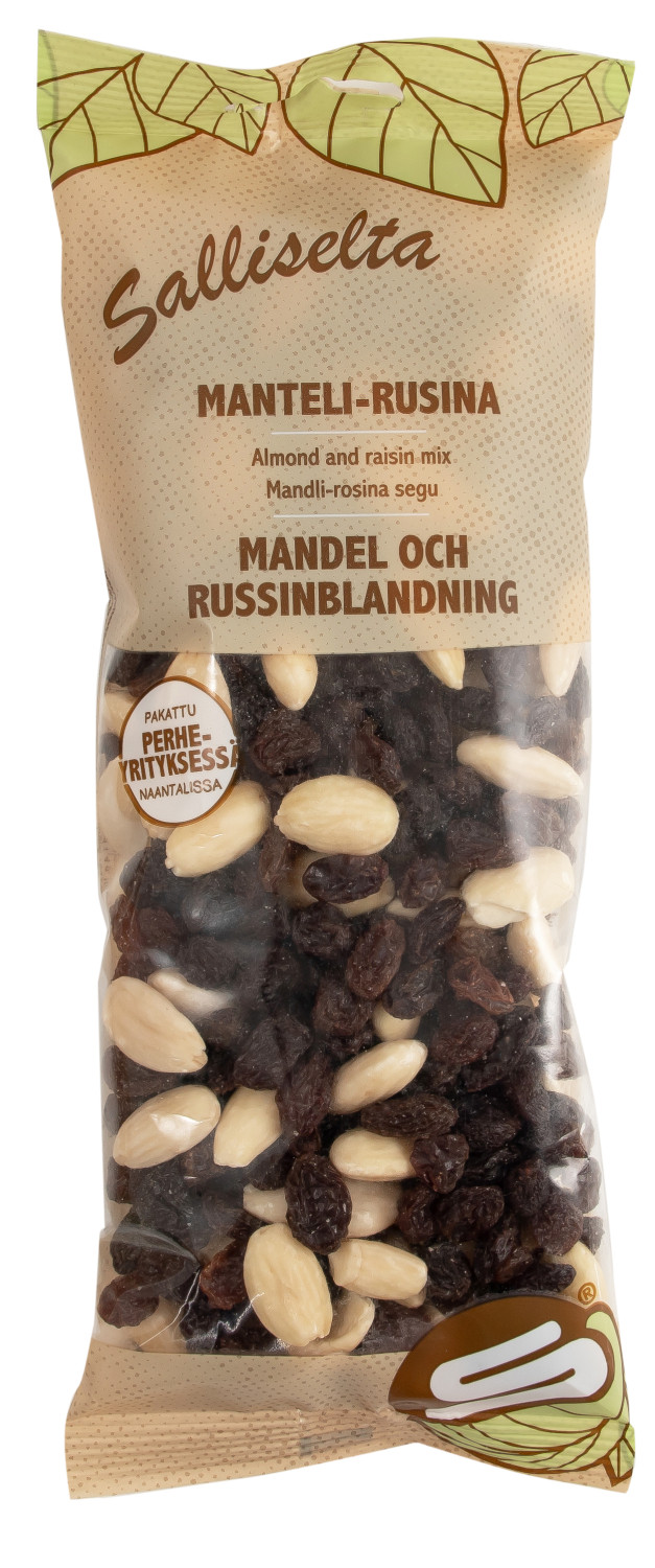 Manteli luokitellaan yleisesti pähkinäksi, mutta se on puussa kasvava kivihedelmä. Manteli on vanhimpia viljeltäviä hedelmäpuita, ja sen suurin tuottaja on tasaisen lämmin Kalifornia. Manteli on erinomainen välipala- ja eväspähkinä. Niitä voi syödä sellaisenaan kuorettomana tai kuorellisina, tai vaikka rouhittuna aamujugurtin joukossa. Niistä voi tehdä helposti myös tahnoja ja ne sopivat hyvin makeaan ja suolaiseen leipomiseen. Mantelit ovat perinteinen joulun herkku rusinoiden kanssa. Valmistettu Suomessa.