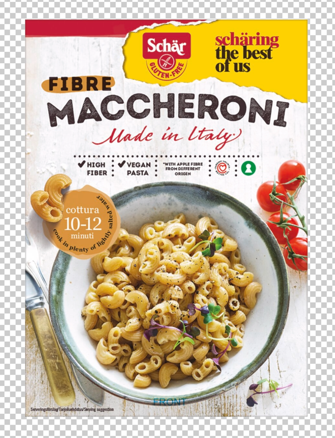 Sama resepti ja maku kuin aikaisemmin, mutta nyt Schärin brändin alla. Schär gluteeniton kuitumakaroni on runsaskuituinen makaroni, jolle on myönnetty paremmasta valinnasta kertova sydänmerkki. Valmistettu italiaisen perinteen mukaan Toscanassa, Italian sydämessä. - Runsaskuituinen - Sydänmerkkituote - Hyvä rakenne - Vegaaninen - Gluteeniton pasta