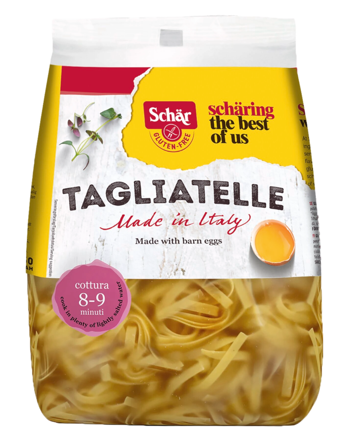 Sama resepti ja maku kuin aikaisemmin, mutta nyt Schärin brändin alla. Schär Tagliatelle on gluteenitonta italialaista nauhapastaa, jossa on aineksena vapaan kanan munia. Nauti rakenteeltaan hyvää ja ihanan keltaista pastaa, joka sopii mainiosti useimpien kastikkeiden kera. - Gluteeniton tagliatelle - Mahtava maku ja rakenne - Laadukas munapasta