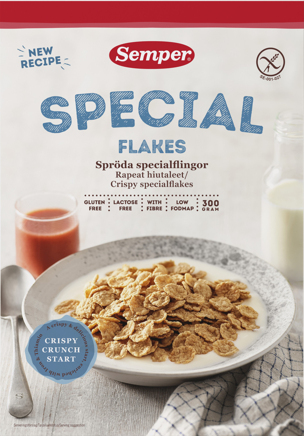 Sempers Special Flakesit ovat gluteenittomia maissista ja riisistä valmistettuja rapeita aamiaishiutaleita. FODMAP-ystävällisissä hiutaleissa on alhainen rasvapitoisuus ja ne sopivat erinomaisesti aamupalalle murokulhoon! - FODMAP-ystävälliset maissihiutaleet. - Alhainen rasvapitoisuus. - Täydennetty B-vitamiineilla ja raudalla, joka edistää immuunijärjestelmän normaalia toimintaa monipuolisen ja tasapainoisen ruokavalion ja terveellisten elämäntapojen takaamiseksi.