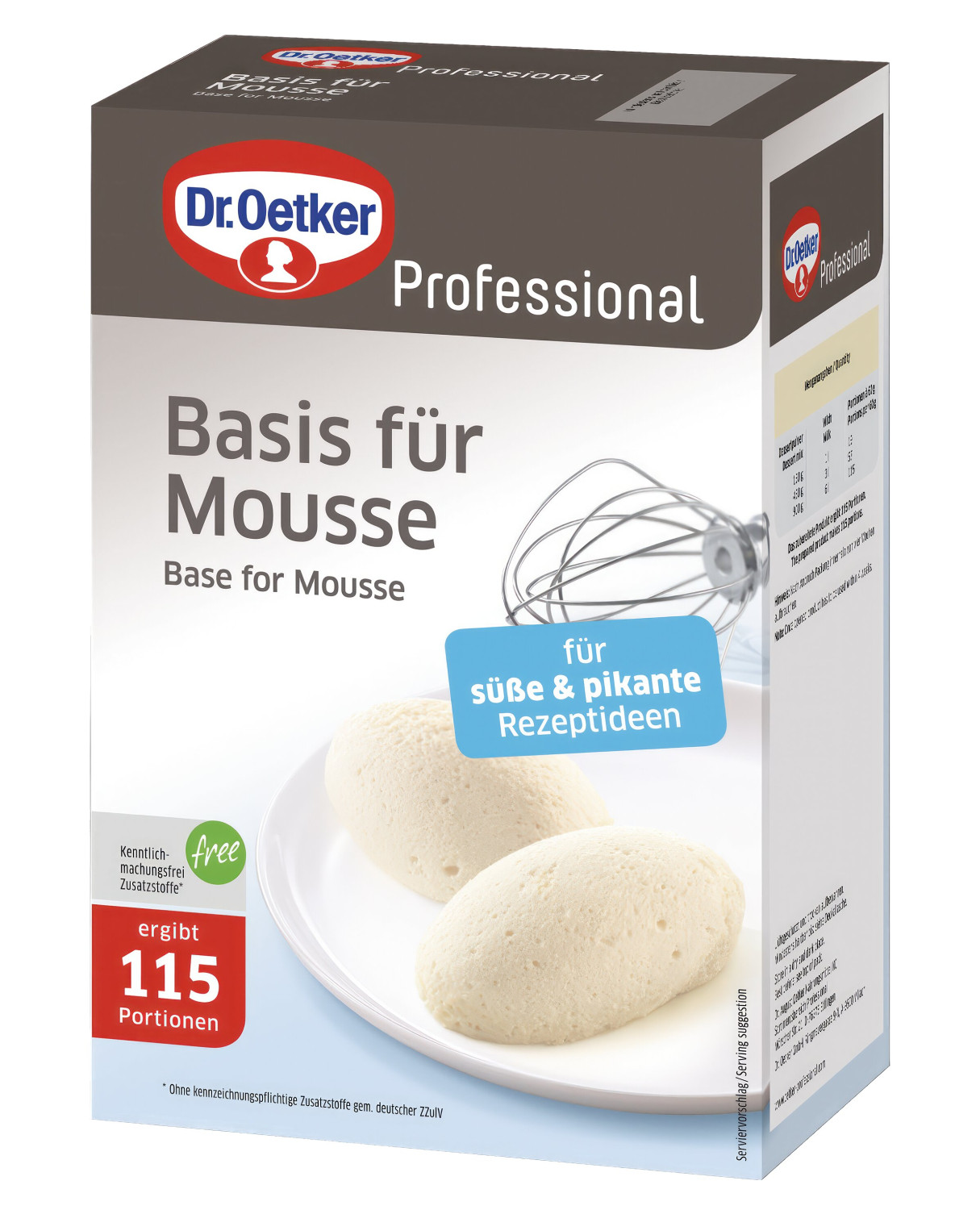 Dr. Oetker Moussepohja on keittiöammattilaisten monikäyttöinen apuri, joka taipuu sekä makeisiin jälkiruokiin että suolaisiin ruokiin. Neutraalin makunsa ansiosta sitä voi maustaa ja tuunata tarpeen mukaan. Lisää jauheeseen vain kylmä neste, vatkaa ja jäähdytä - tuloksena on ilmava ja kermainen mousse.