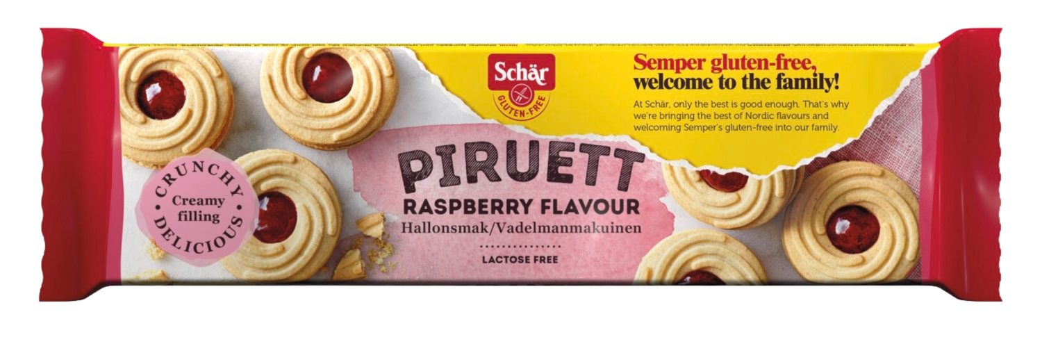 Sama resepti ja maku kuin aikaisemmin, mutta nyt Schärin brändin alla. Täytetyt keksit ovat todellinen klassikko kahvipöydässä. Schärin gluteenittomat vadelmatäytekeksit sopivat täydellisesti lastenjuhliin, kahville, jälkiruoaksi tai herkulliseen kakkubuffetiin. Laktoositon ja vegaaninen sekä ilman lisättyä vehnätärkkelystä.