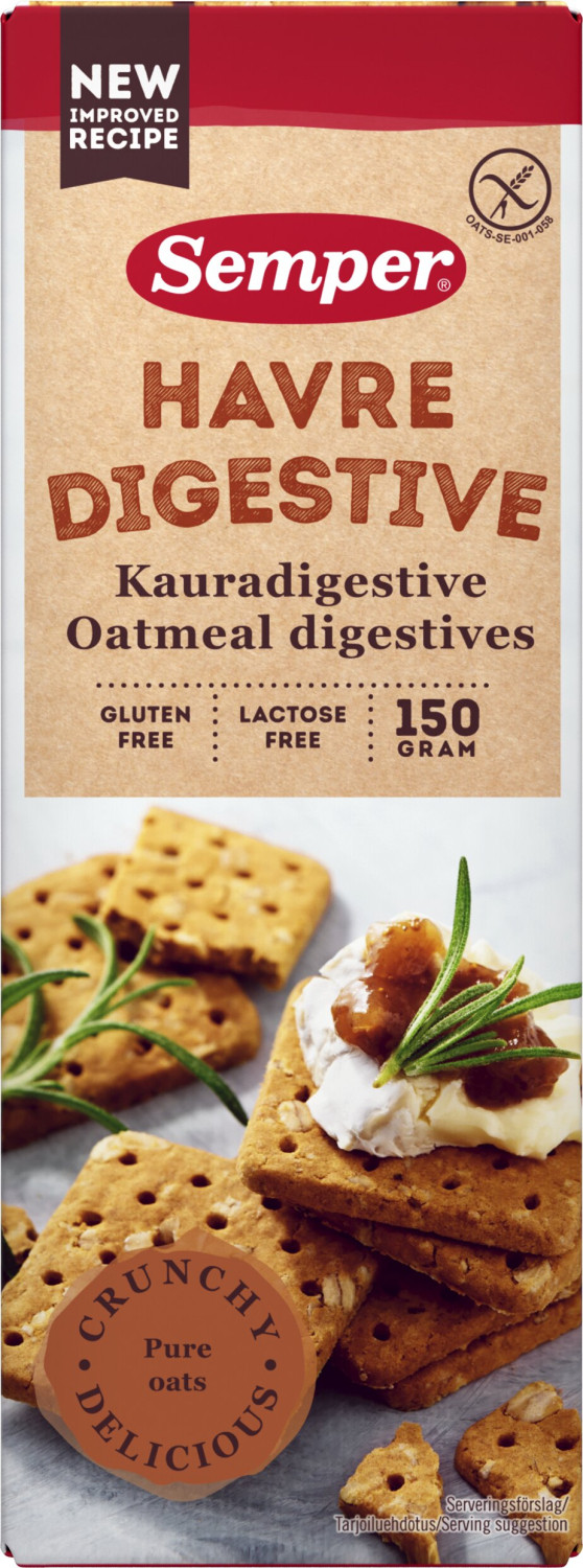 Puhtaalla kauralla valmistettuja Semperin gluteenittomia kauradigestivekeksejä. Tarjoile juustoviipaleen ja viinirypäleiden kera - olipa kyseessä piknik tai juustolautanen. Kauradigestivestä valmistat helposti vaikkapa juustokakun pohjan. Low FODMAP, vegaaninen ja laktoositon. Ei lisättyä vehnätärkkelystä.Lue lisää
