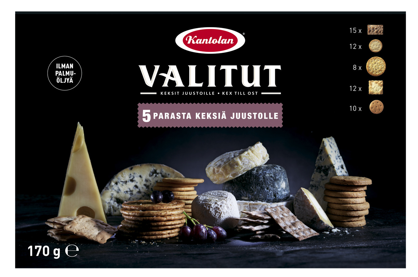 Tähän pakkaukseen olemme keränneet Kantolan-sarjan parhaimpia keksejä, jotka on suunniteltu eri juustojen kanssa nautittavaksi. Yhdistele keksejä mielesi mukaan mietojen, pehmeiden tai kovien suosikkijuustojesi, sekä herkullisten lisukkeiden kuten hunajan ja hillon kanssa. Pakkauksesta näet juustosuosituksiamme sekä tarjoiluehdotuksia. Yllätä ystäväsi tai ilahduta itseäsi. Palmuöljytön.