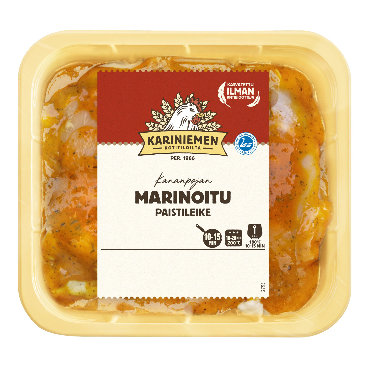 Kariniemen Kananpojan paistileike marinoitu on kananpojan mehevää reisiosaa. Marinadissa pehmeää omenaa, raikasta sitruunaa ja ripaus pippuria. Valmiiksi maustetut paistileikkeet kestävät hyvin pitkää kypsennystä ja grillauksen kuumuutta. Sopii hyvin myös haudutettaviin pataruokiin. Rasiassa 5-7 paistileikettä. Kariniemen Kananpoika on aina suomalaista, ilman antibiootteja kasvatettua kanaa.
