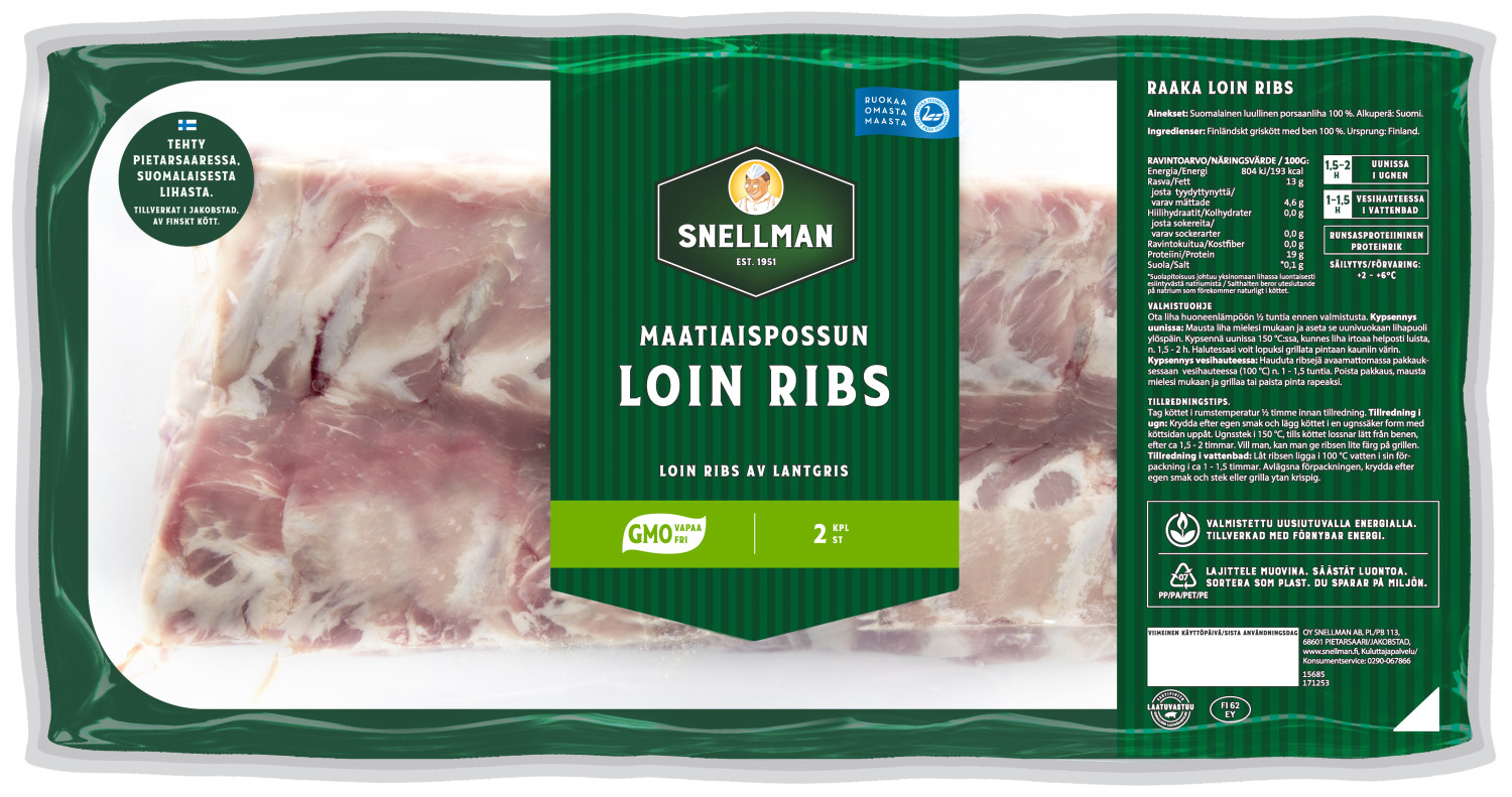 - Snellman Maatiaispossun loin ribs n1,0kg