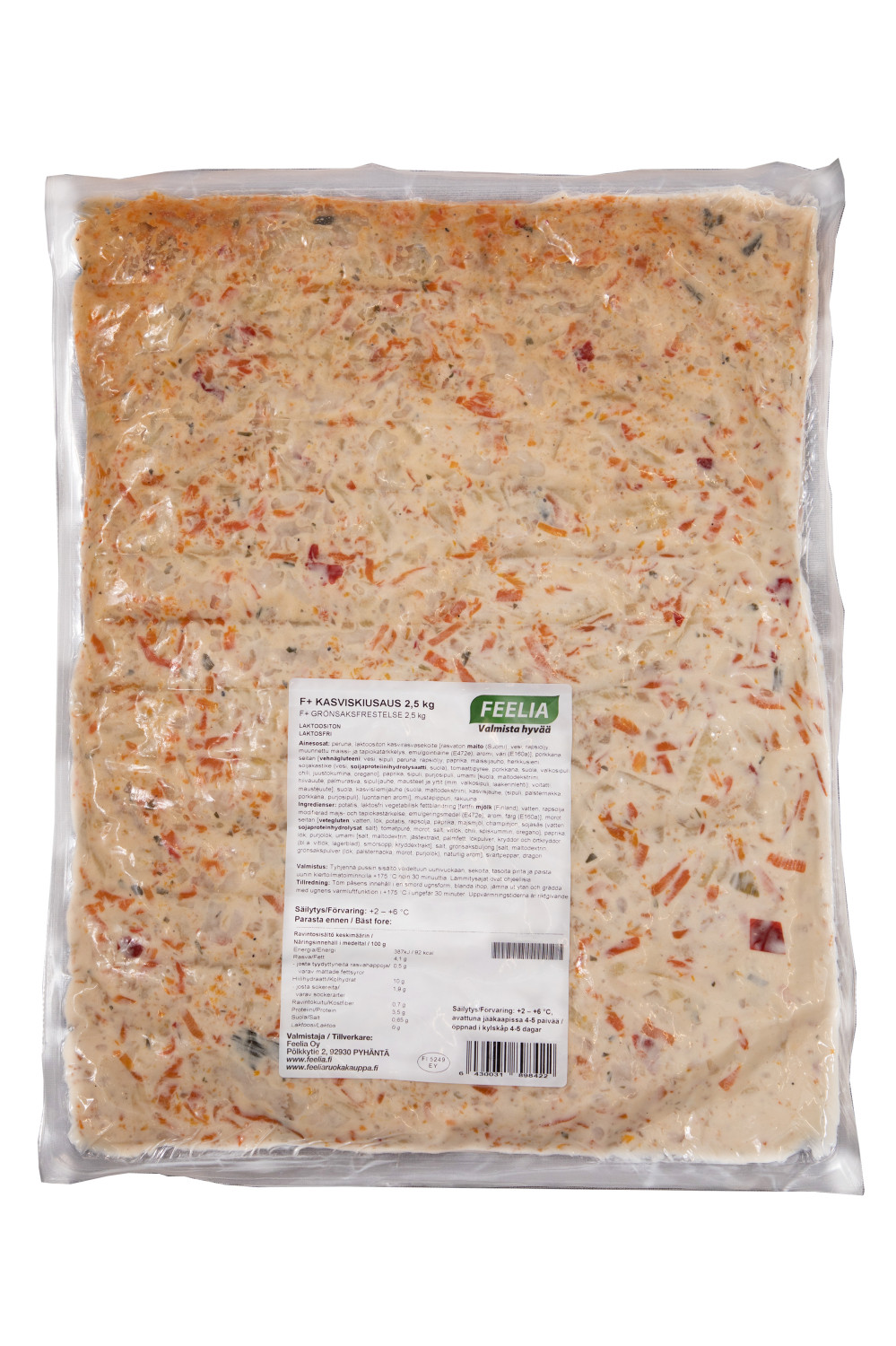 Kypsä, kuumentamista vaille valmis kasviskiusaus. Laktoositon.