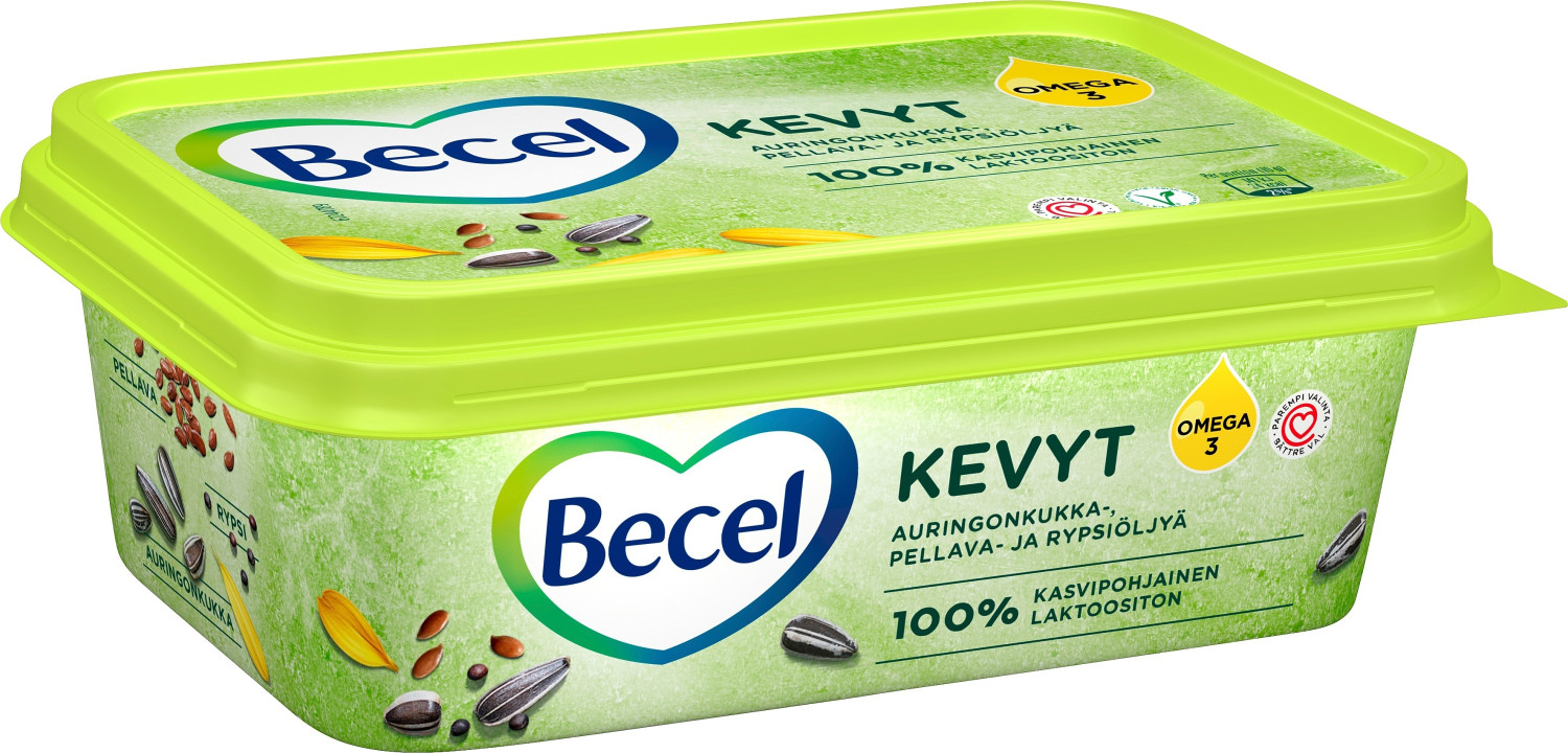 Becel Kevyt kasvirasvalevite on valmistettu auringonkukka-, rypsi- ja pellavansiemenöljyistä ja se sisältää monityydyttymättömiä omega-3- ja -6-rasvoja. Tyydyttyneiden rasvojen korvaaminen tyydyttymättömillä rasvoilla ruokavaliossa edistää veren kolesterolitasojen pysymistä normaalina. Nauti osana terveellistä ja monipuolista ruokavaliota. Laktoosittomassa Becel Kevyt kasvirasvalevitteessä on 38 % rasvaa ja se sopii erinomaisesti leivän päälle. Becel Kevyt kasvirasvalevitteelle on myönnetty Sydänmerkki.