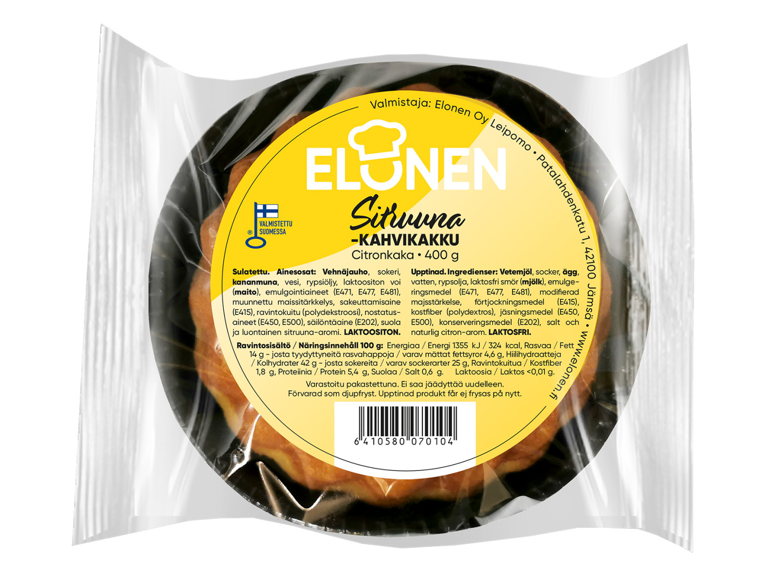VEHNÄJAUHO, sokeri, KANANMUNA, vesi, rypsiöljy, laktoositon voi (MAITO), emulgointiaineet (E471, E477, E481), muunnettu maissitärkkelys, sakeuttamisaine (E415), ravintokuitu (polydekstroosi), nostatusaineet (E450, E500), säilöntäaine (E202), suola ja luontainen sitruuna-aromi. Laktoositon.